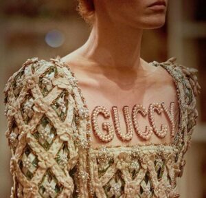My photo of a sought-after $550 knockoff classic Gucci pullover.[/caption](Yes, it’s a counterfeit, but it’s vintage and that’s the pricing difference between flea market vintage and “curated” vintage—But that’s another blog in itself! Yet $550 can still be considered a “deal” as the authentic version will run you about $1,300 on Gucci.com!)So how did knock-offs become influential, highly coveted and trendy?Gucci became “Guccy” for its 2018 Cruise collection.[caption id="attachment_11537" align="alignnone" width="300"]