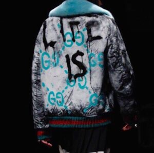 Elevated street wear: GucciGhost jacket.[/caption]Daniel “Dapper Dan” Day was a couturier who ran a Harlem boutique in the 80’s. His work was a juxtaposition of “high” and low, he would mix and stitch iconic replica luxury logos and patterns (Fendi, Louis Vuitton, Gucci) with smaller independent labels to produce his own idiosyncratic designs.[caption id="attachment_11535" align="alignnone" width="300"]